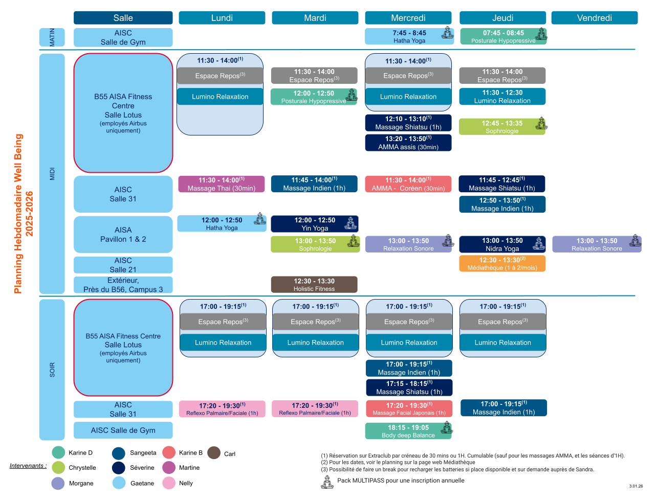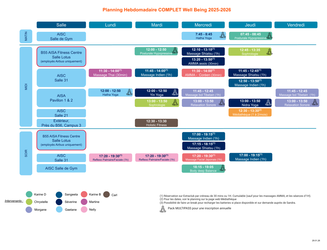 - Des activités hebdomadaires en groupe: Sophrologie, Relaxation, Gymnastique Abdominale Hypopressive, Yin Yoga, Nidra Yoga, Hatha Yoga, Holistic Fitness, Relaxation Sonore et Body Deep Balance.